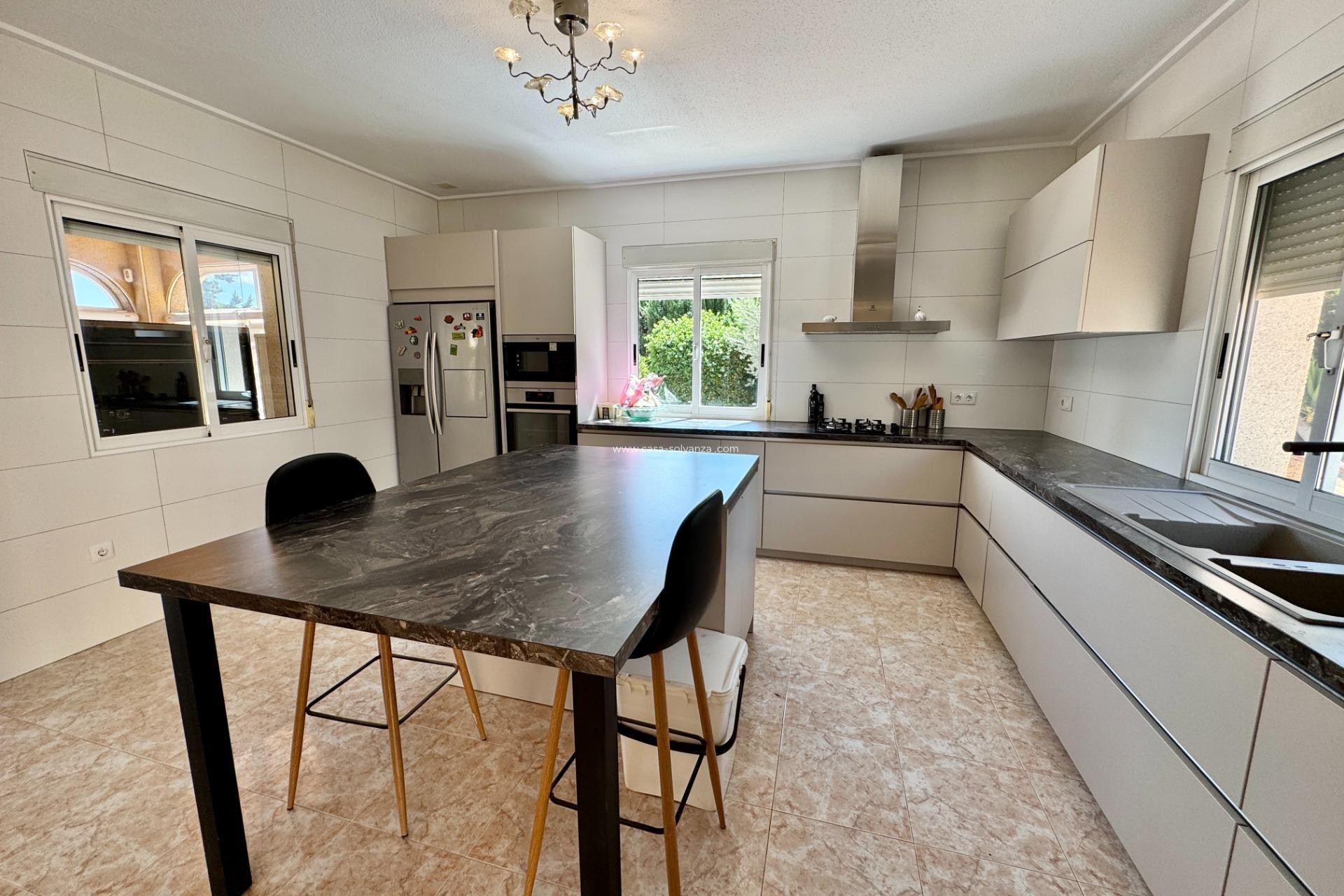 Villa de charme avec studio indépendant à Dolores. Située dans un quartier très recherché de Dolores, à seulement 15 minutes à pied du centre-ville, cette superbe villa offre 224 m² habitables sur une parcelle clôturée de 2.000 m², garantissant espace, intimité et verdure. La propriété comprend également un studio indépendant avec salon/salle à manger/chambre, cuisine et terrasse privée donnant sur le jardin et la piscine – idéal pour recevoir famille, amis ou pour un usage locatif. 🏠 Maison principale 2 chambres doubles avec placards (suite parentale avec dressing) 2 salles de bains complètes Salon-salle à manger spacieux et lumineux avec cheminée Cuisine Schmidt neuve et entièrement équipée Grande véranda vitrée avec vue sur le jardin et la piscine 🌿 Extérieurs & Atouts Terrain paysager de 2.000 m² avec palmiers, arbres fruitiers et plantes méditerranéennes Grande piscine avec jacuzzi Cuisine d’été, bar et espace BBQ – parfait pour recevoir Terrasses couvertes & plusieurs débarras Fosse septique conforme aux normes européennes 16 panneaux solaires pour une efficacité énergétique optimale Système d’alarme Verisure & climatisation Parking pour 4 voitures avec portail électrique 👉 Une villa alliant confort, charme et performance énergétique – idéale comme résidence principale ou maison de vacances !