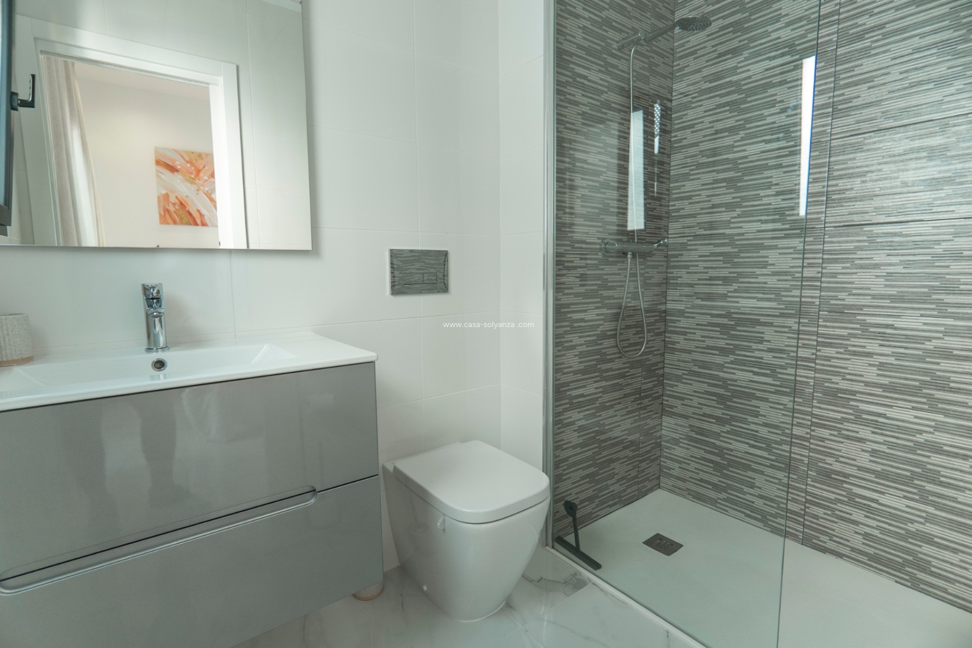 Le rez-de-chaussée comprend une chambre double et une élégante salle de bains familiale avec douche à l'italienne, idéale pour les invités ou ceux qui souhaitent dormir au rez-de-chaussée. Un imposant escalier avec balustrade en verre mène à l'étage, où se trouvent deux spacieuses chambres doubles. La chambre principale (12,4 m²) dispose de deux placards intégrés, de portes-fenêtres donnant sur une terrasse privée et d'une luxueuse salle de bains attenante avec douche à jets puissants. La deuxième chambre double (12,5 m²) dispose également de placards intégrés, d'une élégante salle de bains attenante et d'une terrasse privée.