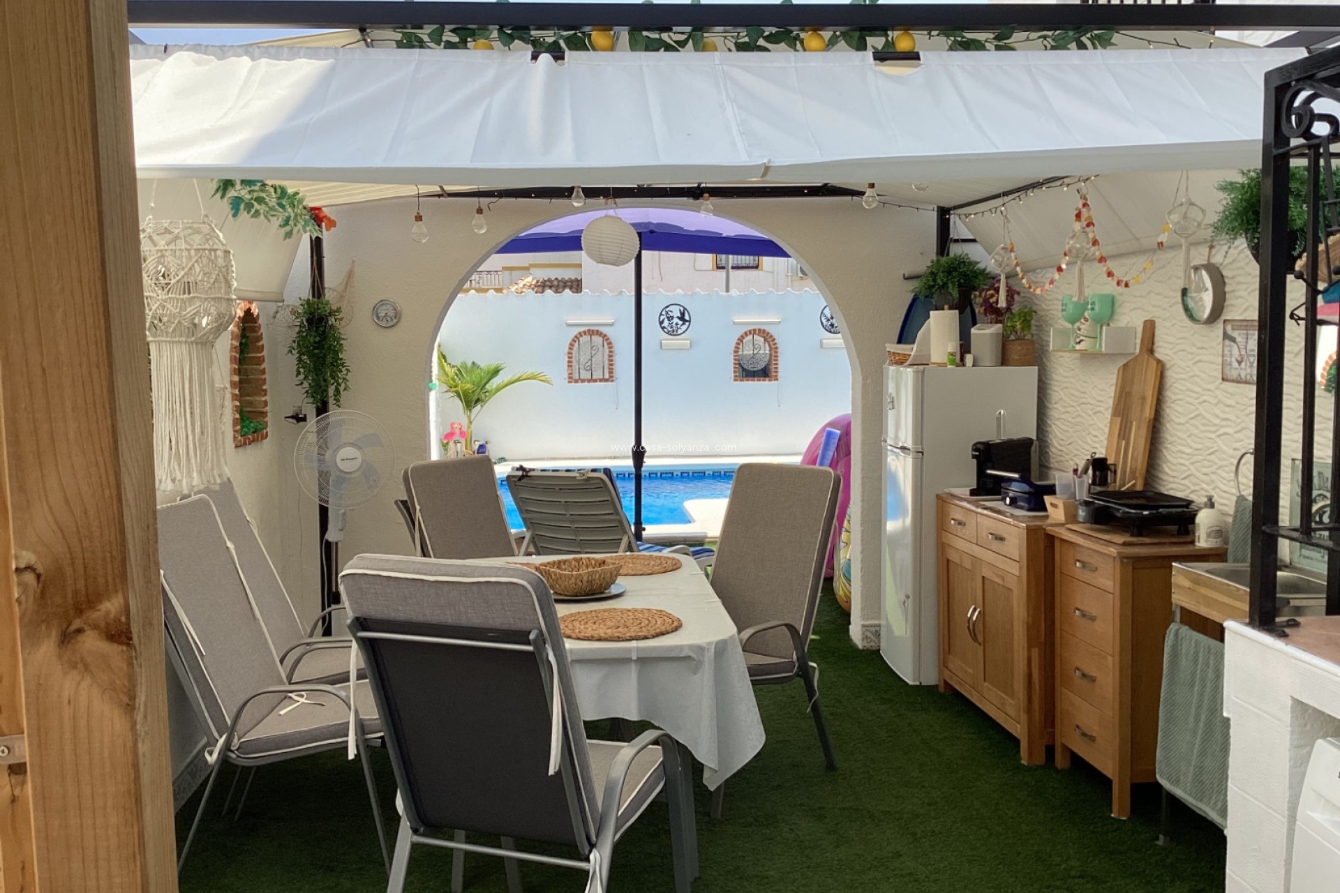 3 chambres doubles spacieuses, chacune avec placards et climatisation individuelle. 2 salles de bain, dont une salle de bain familiale entièrement rénovée au premier étage. Salon et salle à manger spacieux avec climatisation — parfait pour se détendre ou socialiser. Cuisine séparée entièrement rénovée, moderne et meublée de manière pratique. Chambre et salle d'eau au rez-de-chaussée – idéal pour des invités ou une vie de plain-pied. Espace terrasse agrandi, en partie équipé de parois vitrées pour profiter de l'extérieur toute l'année. Grand jardin avec piscine privée, chauffée par des panneaux solaires respectueux de l'environnement. Cuisine extérieure sous un joli gazebo, parfaite pour les dîners d'été. Dream Hills possède une belle communauté avec des terrains de sport, de pétanque, de tennis de table, un court de tennis et un centre de fitness en plein air.